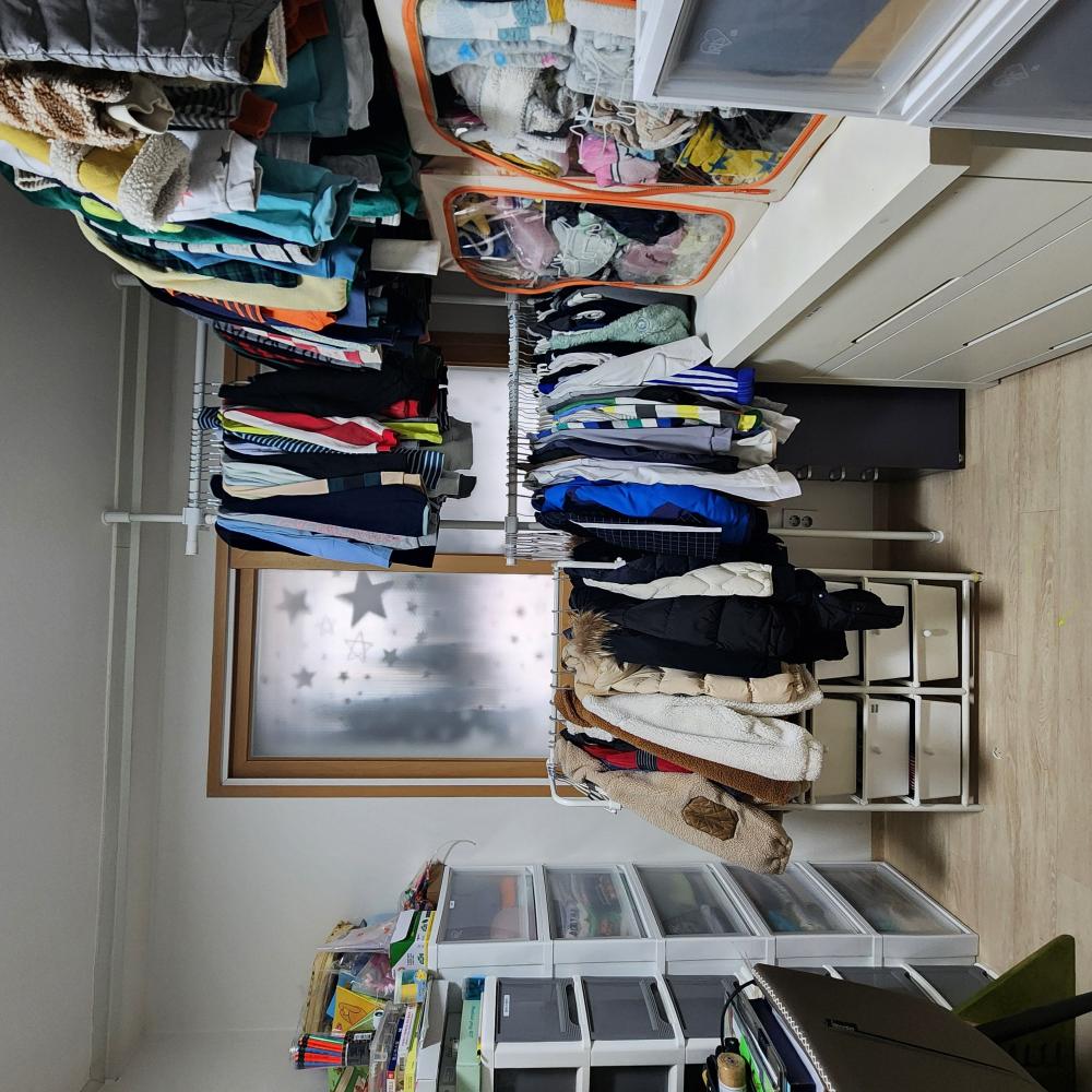 행거를 설치하고 옷걸이를 사용하여 자녀들의 의류 수납